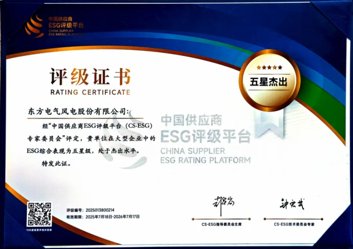 東方風(fēng)電立足企業(yè)高質(zhì)量發(fā)展與目標(biāo)實現(xiàn),圍繞國家戰(zhàn)略與行業(yè)轉(zhuǎn)型、“雙碳”目標(biāo)落地等方面,主動履行央企社會責(zé)任,樹立國企典范。在環(huán)境、勞工與人權(quán)、可持續(xù)采購、社會貢獻(xiàn)、公平運(yùn)營與ESG公司治理等多方面落實可持續(xù)發(fā)展理念,最終獲評“中國供應(yīng)商ESG評級(大型企業(yè))五星杰出”企業(yè)。